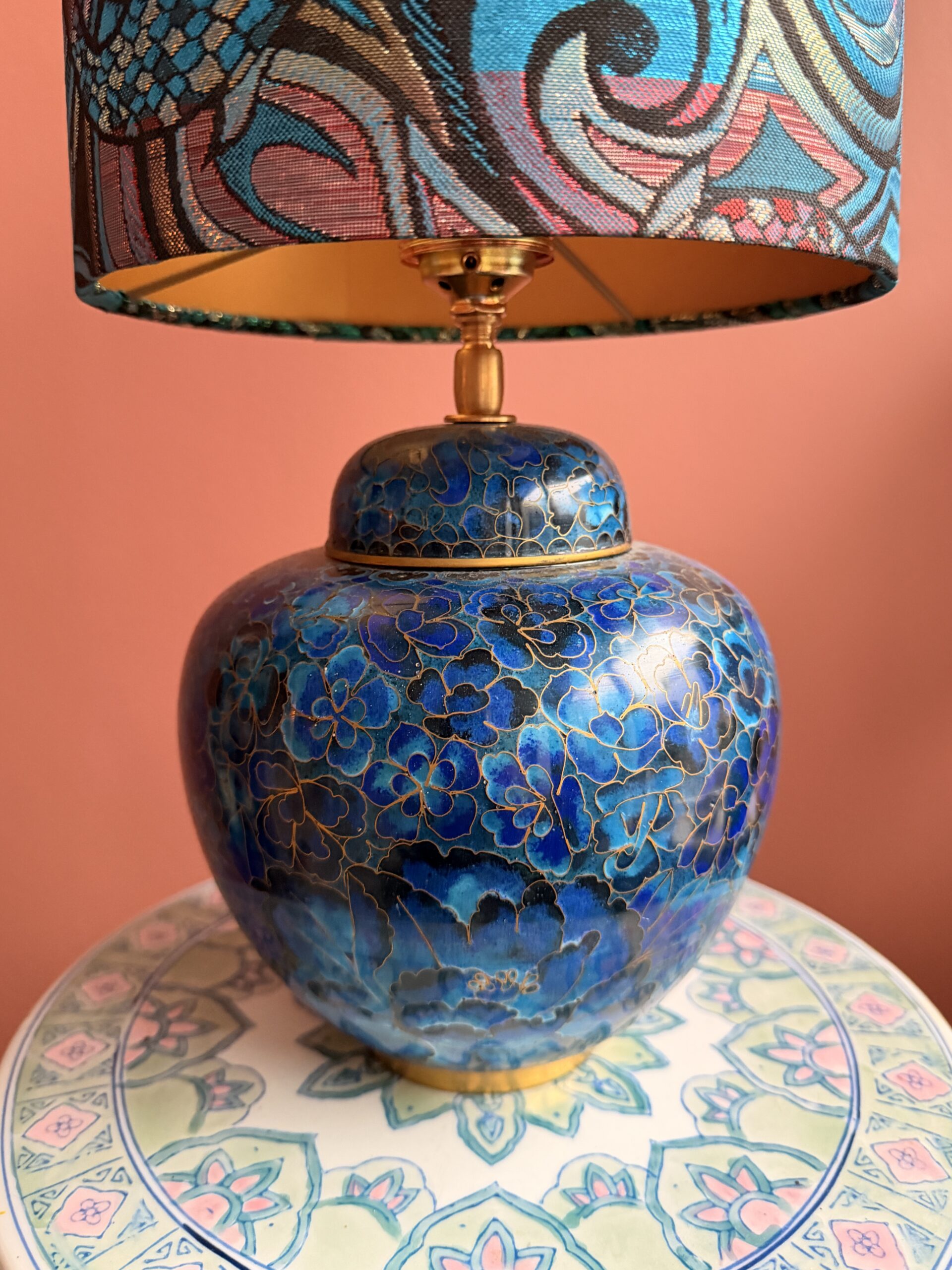 Deze lamp is een feestje voor wie van blauw houdt! De voet is gemaakt van een Chinese cloisonné-pot, met kleine bloemetjes in verschillende tinten blauw. Bij cloisonné worden metalen draadjes gelegd en vakjes gevuld met kleur, waardoor elk bloemetje zijn vorm behoudt en de kleuren en vormen niet in elkaar overlopen.