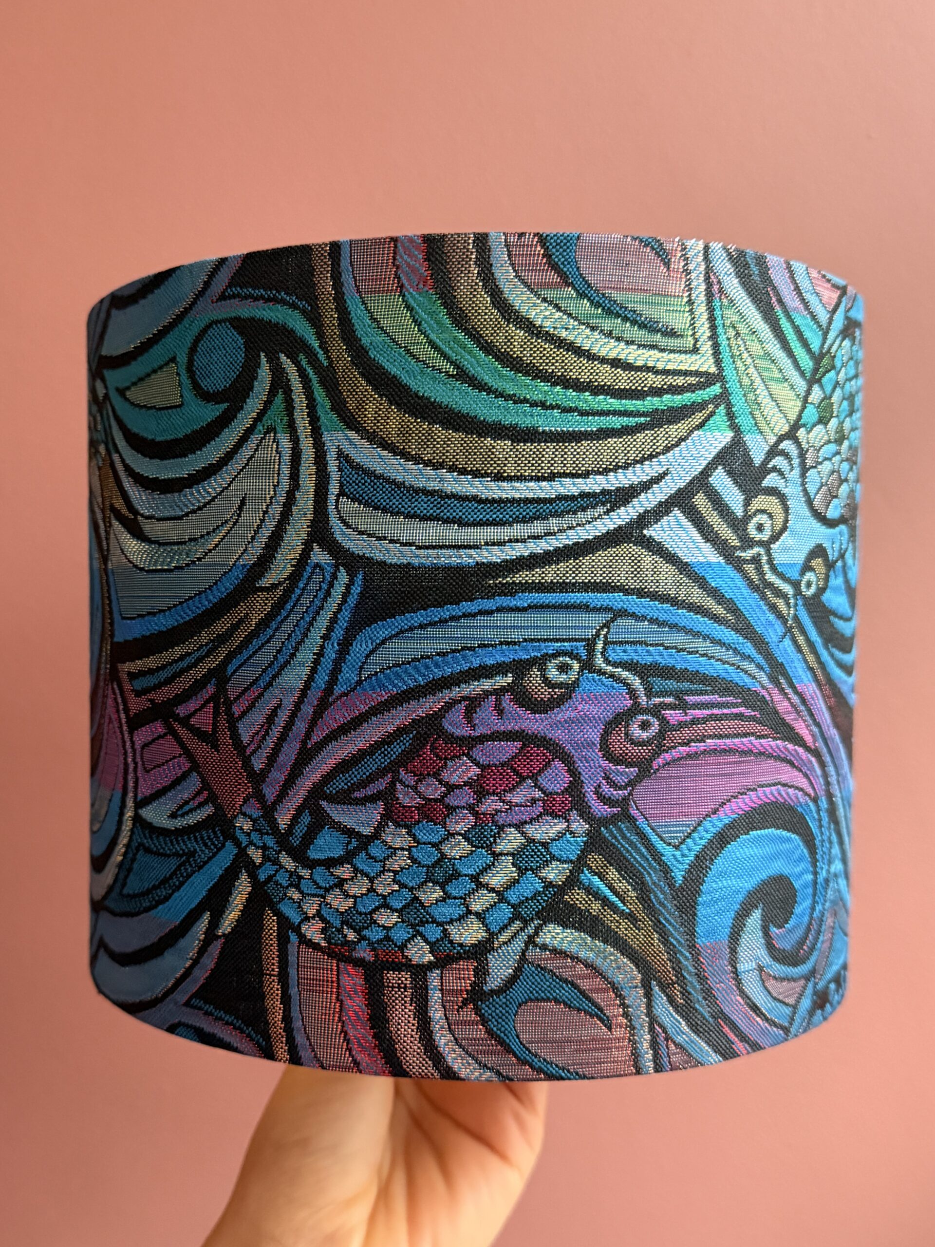 Op de voet zit een bijpassende kap met koikarpers die door golvend water zwemmen. Een gedurfd duo!