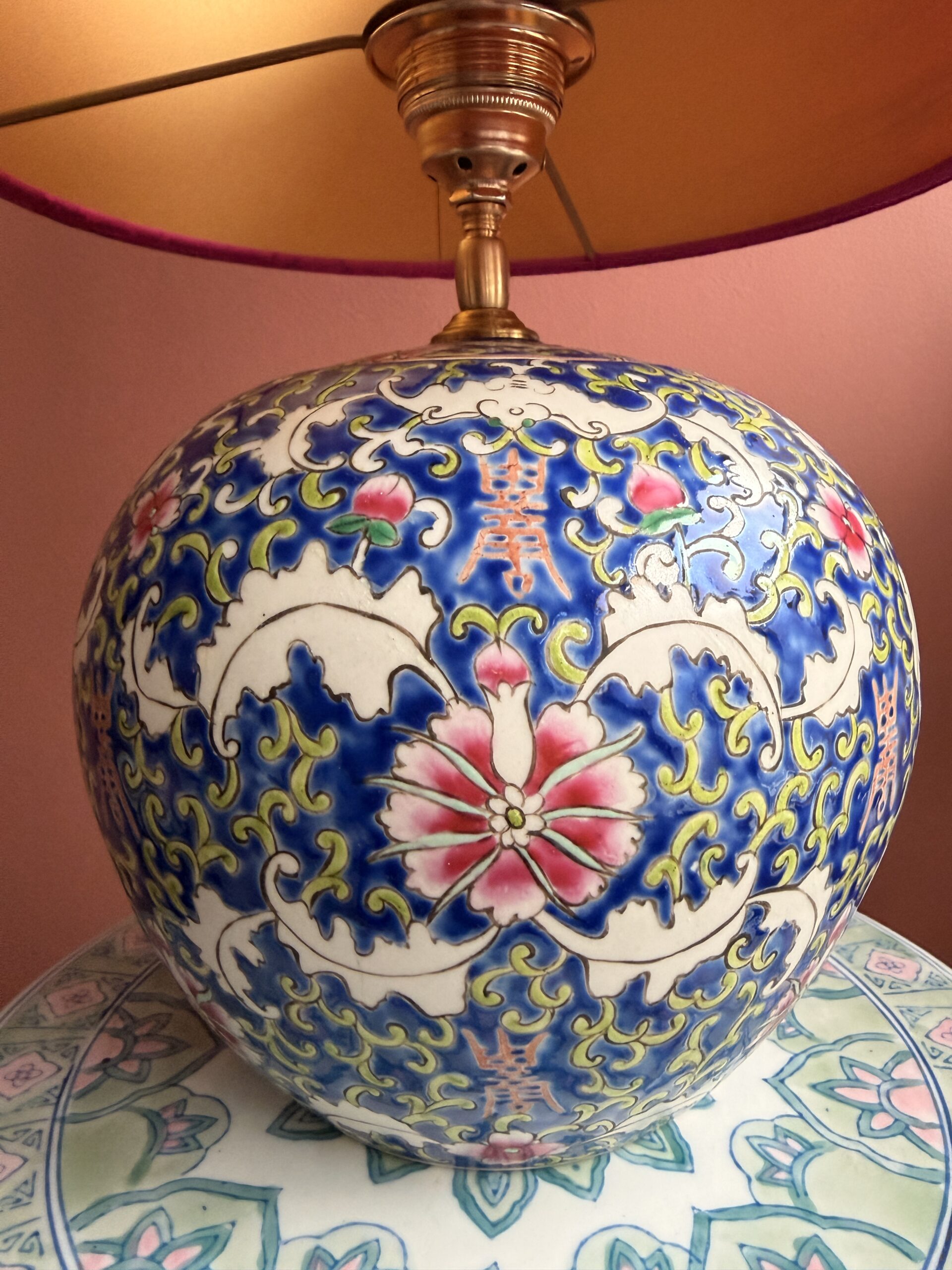 De lampenvoet is een prachtige blauwe Chinese dekselpot, die ik onlangs op een klein antiekmarktje in Toscane vond. Het diepe blauw combineert geweldig met fuchsia, daarom kreeg de lamp een fuchsia kap in ruwe zijde! Ruwe zijde voelt natuurlijk en lichtgrof aan en laat het licht op een zachte, gezellige manier doorschijnen.
