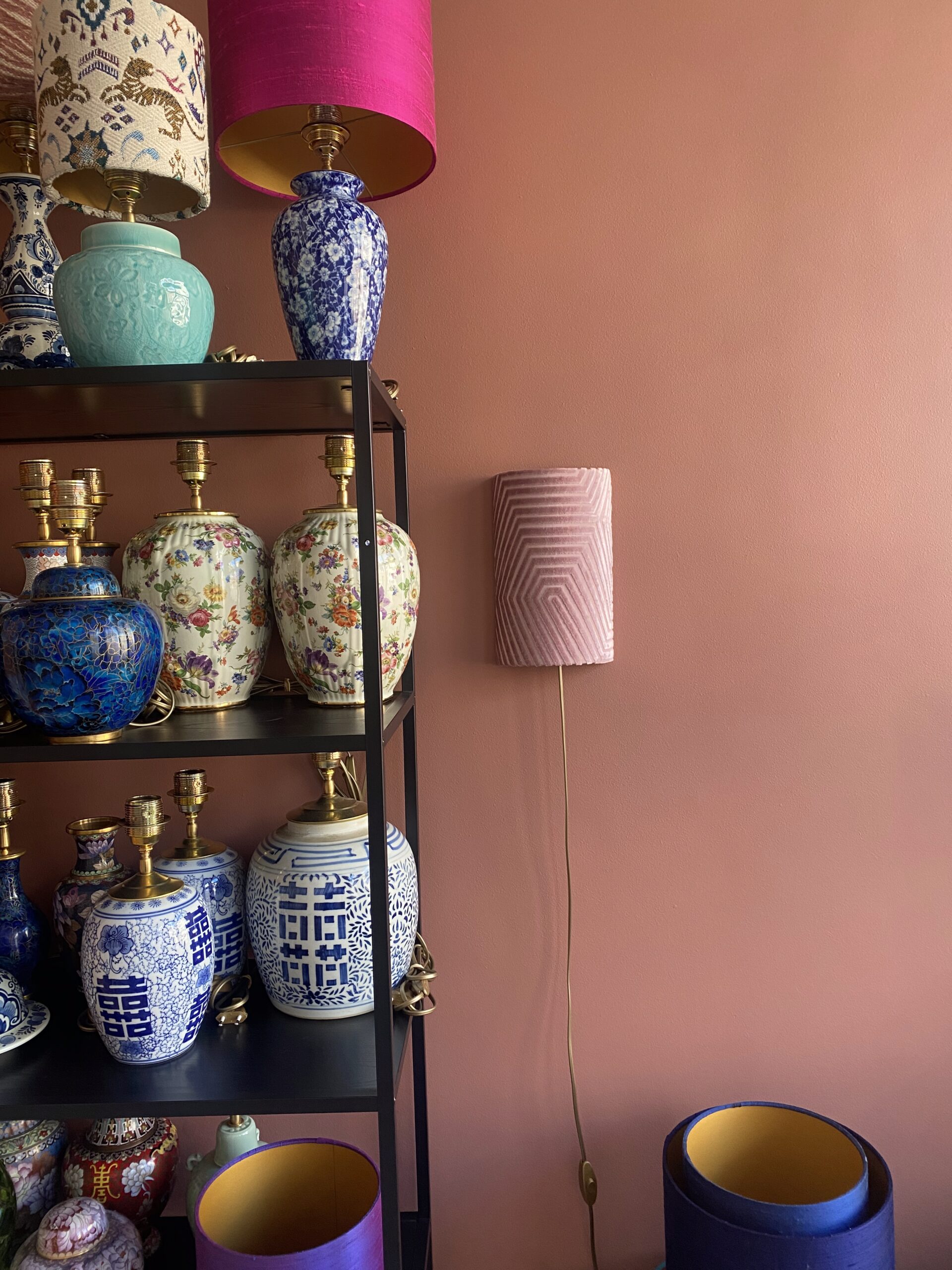 Een superleuke wandlamp van zacht velours in pastelroze. De stof heeft een leuk 3D-effect en zodra het licht aanstaat, komt het patroon in de stof mooi naar voren. De stof is ook beschikbaar in beige, blauw en rood.